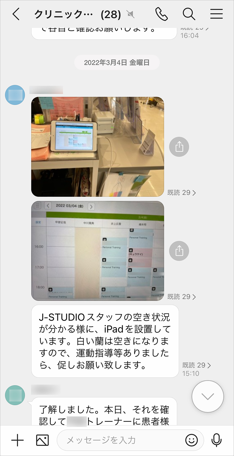 リハビリ部は患者さまにリハビリを行う部署やジムを担当する部署など、4つの部署によって構成されています。LINE WORKS導入後はグループを活用することで、部全体で共有すべき情報と特定の部署だけで共有すべき情報を切り分けて発信できるようになりました。以前はよく見られた「言った/聞いていない」のトラブルは、大幅に改善されたと思います。既読の付かない職員だけに電話をするといった対応ができるのも便利です。