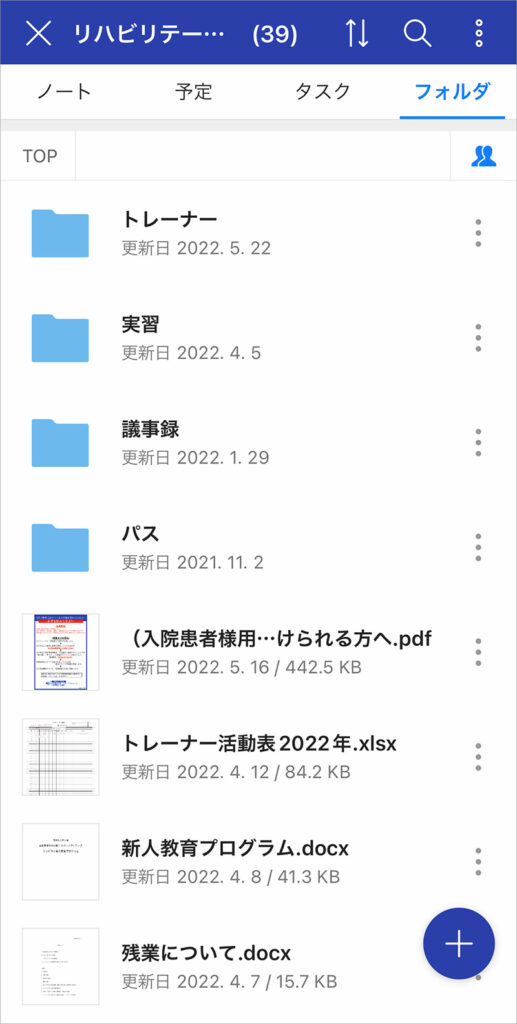 業務に関するドキュメント類は、グループ機能のフォルダやノートで共用。文書ファイルだけではなく、リハビリのノウハウを説明する動画なども保存しています。経験の浅い職員が、患者さまの走り方や関節の動きなどを撮った画像を共有して、先輩職員からアドバイスをもらうことも可能です。こうした使い方で手軽にナレッジを引き継げるようになりました。