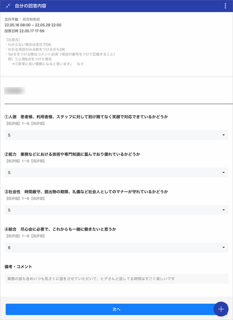 職員の満足度を高めるため、アンケート機能の部分に常時「職員意見箱」を設置しました。法人に対する不満点や気づいたことなどをアンケート機能でヒアリングし、職場環境を改善するヒントとして活用しています。上長、同僚、部下などさまざまな立場の人が対象者を多角的に評価する「360度評価」を人事考課に採り入れており、そのための評価シートもアンケートで実施しています。紙の用紙と違ってスムーズかつ漏れなく回答を得ることができます。