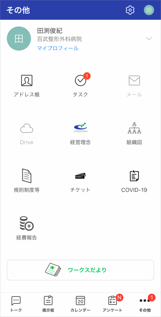 経営理念や就業規則、コロナ対応マニュアルなどが記載された院のホームページや、経費精算をするためのフォームなどへのリンクを「その他」のメニュー画面に配置。LINE WORKSを必要ツールへのアクセスの起点として職員にとって使いやすくカスタマイズしています。