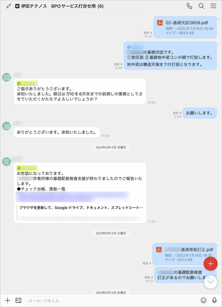 Photoructionには建設BPOサービスのオプションもあり、写真、図面、書類などのデータをアップロードするだけで工事写真台帳作成、書類のデータ化、図面からの数量拾いといった業務を代行してくれます。当社では配筋検査野帳の作成に際して検査書類と図面の紐づけまでしてもらうことで、業務を大きく省力化できました。PhotoructionのオペレーターもLINE WORKSを使っており、BPOサービスの利用時は外部トーク連携を使ってグループトークでやり取りをしているので、書類やデータの受け渡しも非常にスピーディです。