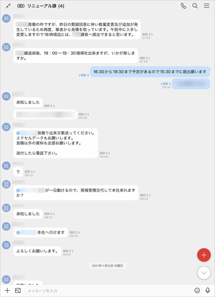 例えば「配筋検査が無事に完了しました」といった、緊急性はないものの確実に伝えておきたい上長への報告はすべてトークで送るようになりました。応答してもらえないことが多い電話と違って確実に用件を伝えられ、既読が付けば「見てもらえたんだな」と安心できます。言葉だけでは説明しにくい現場の状況を、写真を添付して説明することもよくあります。