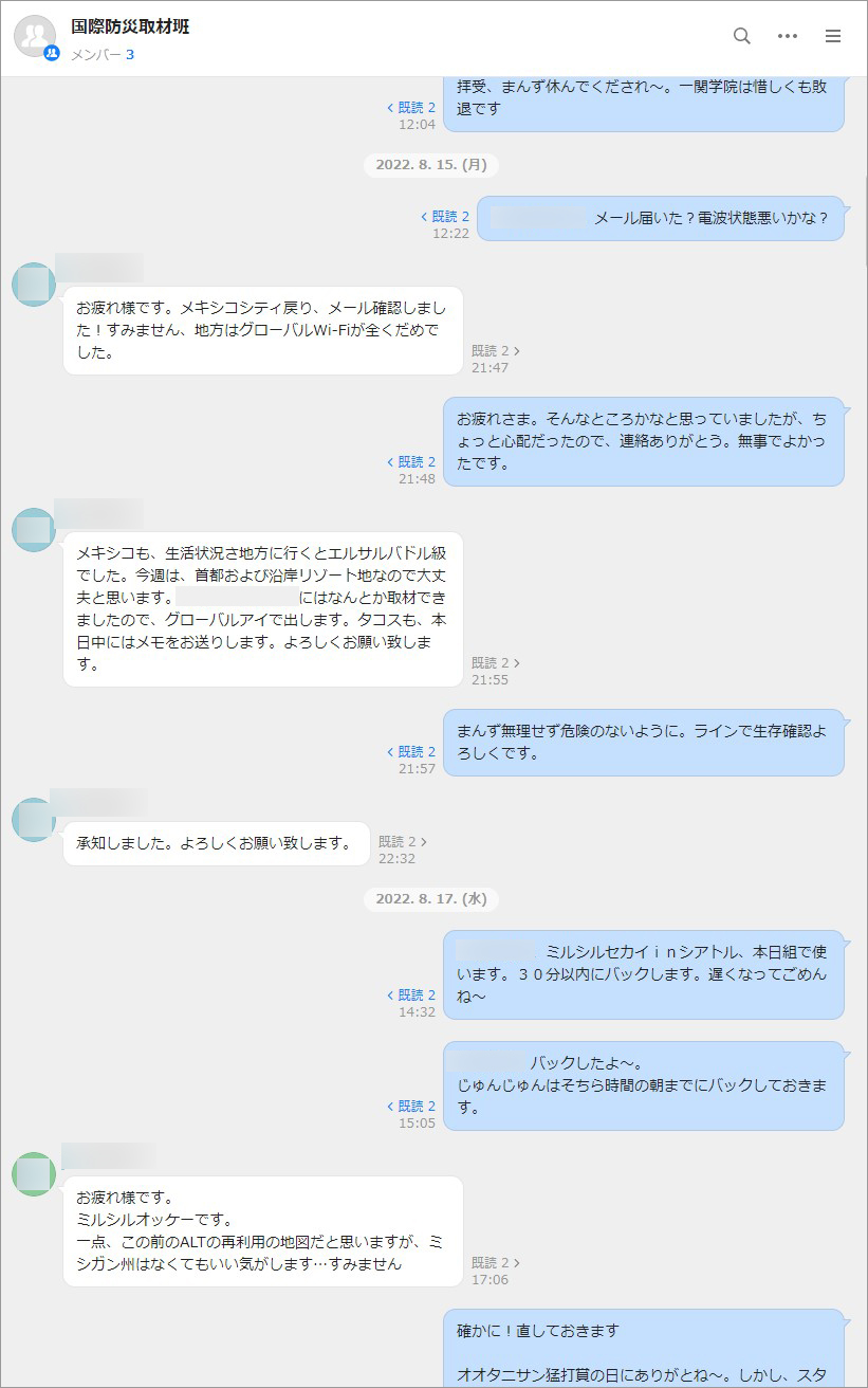 海外に派遣された記者は孤独感に苛まれることが多々あります。過度な孤独は記事のクオリティ低下にもつながりかねないため、グループトーク上では記者に「よく頑張った」「お疲れ様」などとこまめにフォローを入れるなど、孤独感の解消につなげています。