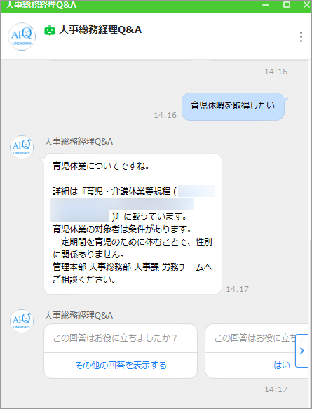 よくある質問にAIチャットBotが回答。そのインターフェイスをLINE WORKSにすることで人事総務経理のヘルプデスク業務を省力化した