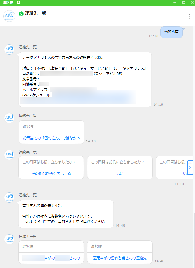 AIチャットBotを使った連絡先検索機能もLINE WORKSと連携。調べたい社員の苗字をトークに入力すると瞬時に回答し、同じ苗字の社員が複数いる場合は選択肢が示される