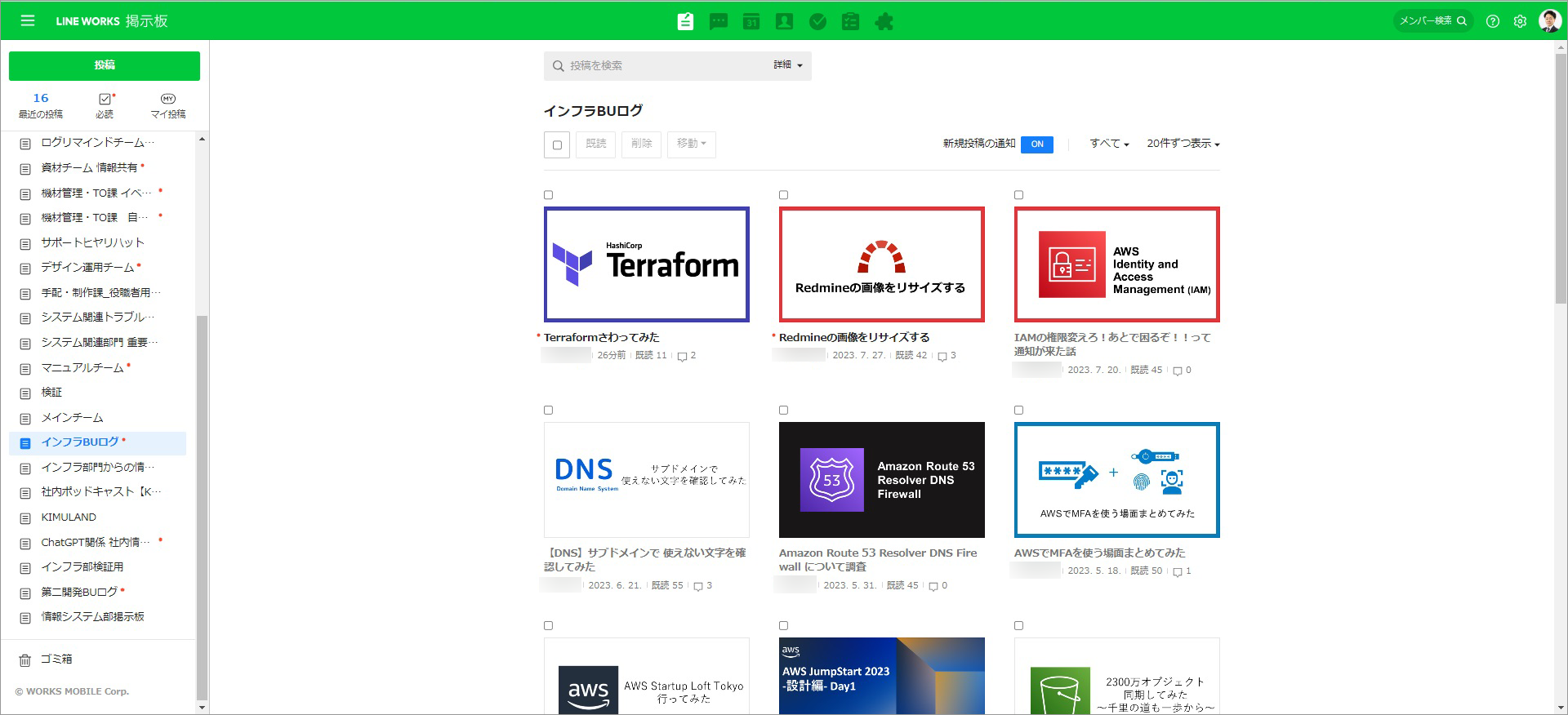 会社からの通達などは以前からグループウェアの掲示板で周知しており、LINE WORKSの掲示板は主にエンジニアが技術的な話題を投稿する場になっています。技術系の疑問やトラブルに直面した社員がその内容を投稿すると、部門や役職とは無関係に解決策を知っている社員がアドバイスを書き込むといった使い方がされ、社内のナレッジ共有が促進されています。