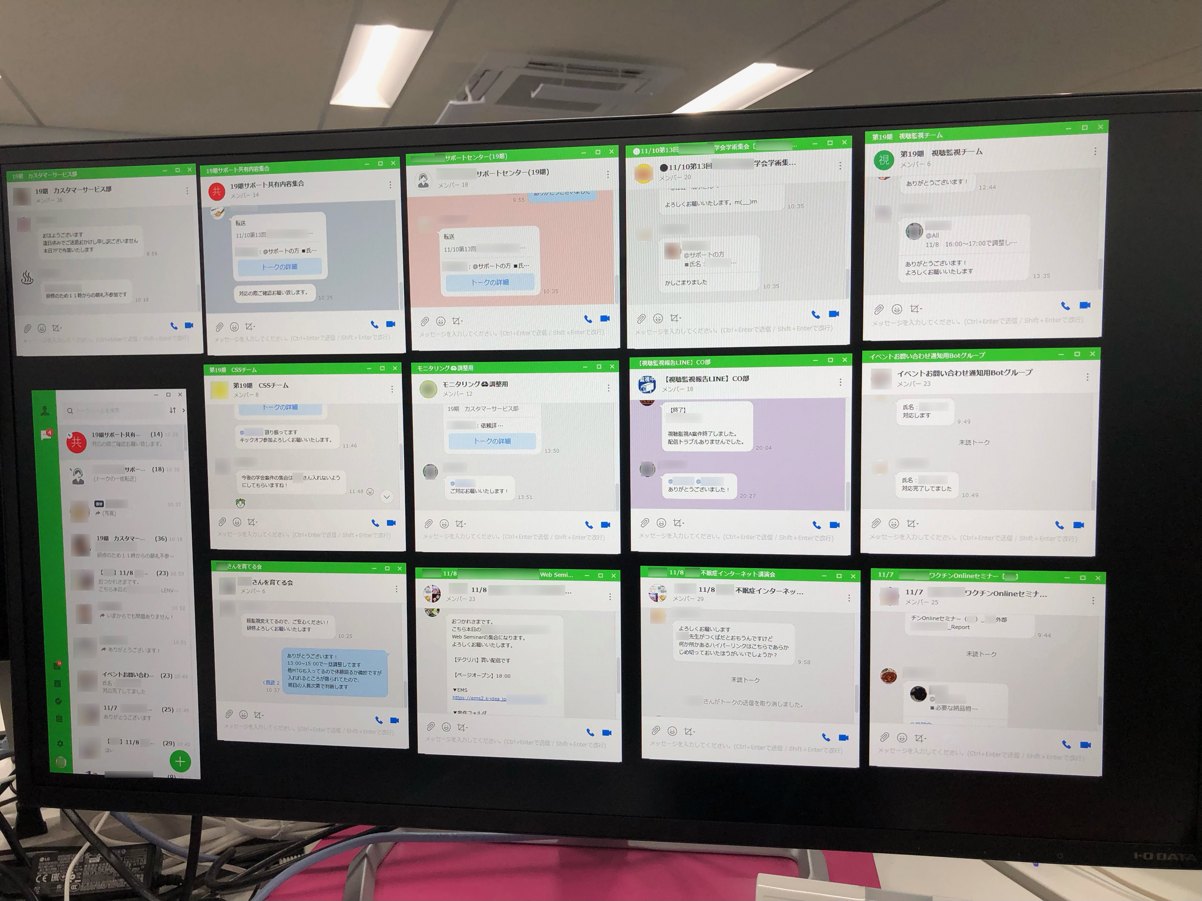 コールセンターのスタッフは同時に行われることもある複数のライブ配信イベントのお客さま対応をすることがあり、その場合は各配信の担当スタッフを結ぶトークルームの画面をモニターに常時並べて表示。そのことによっても迅速な対応をすることが可能になっています。