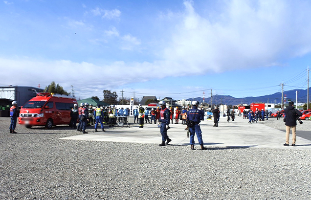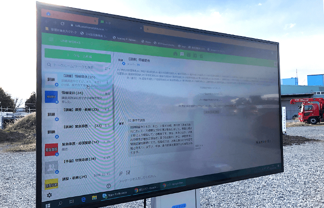 2月に厚木市内にある神奈川県消防学校で行われた、県内の全消防本部が集まっての「かながわ消防訓練」では、救助や搬送などの実動訓練とともに、大画面モニターにトーク画面を写しながら、LINE WORKSで県と消防本部が連絡を取り合う情報受伝達訓練も実施しました。迅速に情報共有がなされる様子に対して、来賓者の方々から高い評価をいただきました。