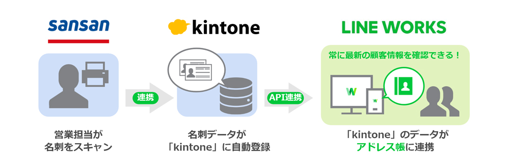当社ではさまざまな情報のデータベースとしてkintoneを採用しています。LINE WORKSとのAPI連携によりkintoneにある顧客情報をLINE WORKSのアドレス帳に自動的に登録されるようにしました。具体的には、まず名刺管理サービスSansanで登録した名刺データがkintoneにAPI連携で自動的に一括登録され、さらにそのデータがAPI連携によってLINE WORKSのアドレス帳に登録・更新されます。同じ人物の名刺データはkintone内で最新情報に更新されるので、営業担当者は名刺をスキャンするだけでよく、普段使いしているLINE WORKSのアドレス帳で常に最新の顧客情報が確認できます。
