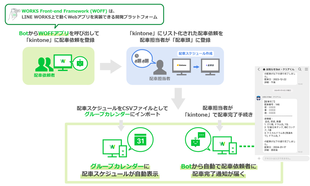具体的には、LINE WORKSからWOFF経由でkintoneに配車依頼を登録すると、それを元に配車担当者が配車頭でトラックの配車スケジュールを作成。そのスケジュールをLINE WORKSのグループカレンダーにインポートすることで、カレンダーを自動表示させています。そして配車が完了すると、配車完了通知をグループトークにBotで配信しています。