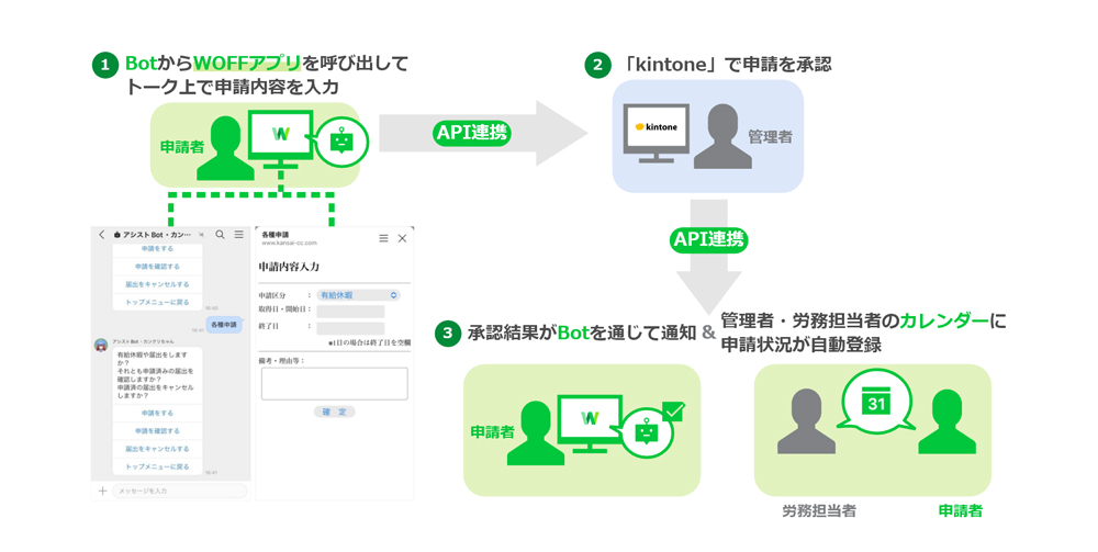 WOFFアプリはkintoneのデータベースとAPI連携しています。送信された申請内容はkintoneに反映され、管理職はkintone上で申請の承認を行います。申請結果はBotを通じて申請者のLINE WORKSに通知され、管理者と労務担当者のスケジュールに申請状況が自動登録されるようにしています。