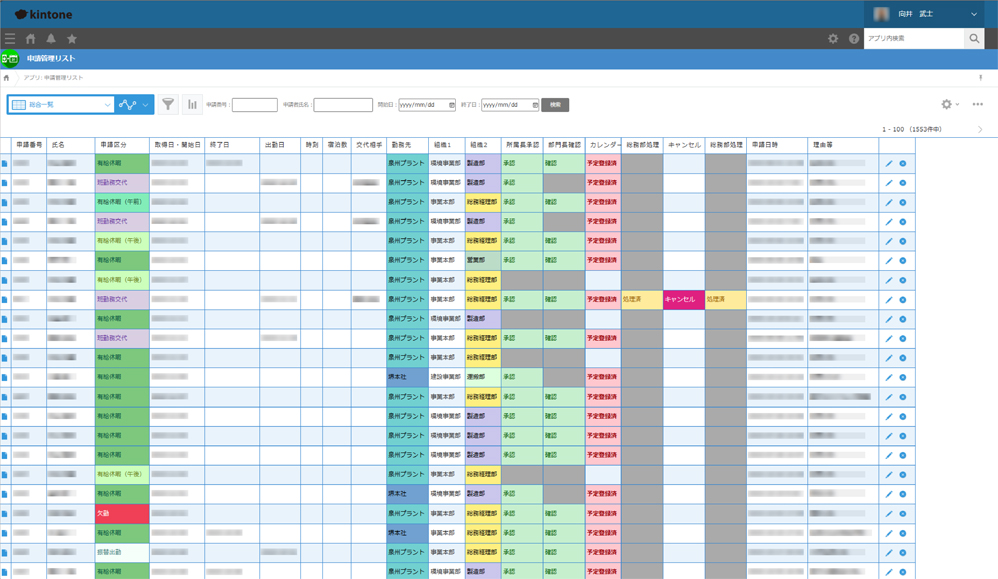 当社は年間約350日稼働しており、泉州プラントでは3班に分けてそれぞれ異なるシフトを組んでいます。休日出勤や振替出勤、早番・遅番の調整、有給休暇を含む各種休暇の申請など、シフトの変更に関する調整も必要です。WOFFアプリによる申請手続きは、申請者側の負荷軽減だけでなく、管理側もkintoneに一元管理できたことで業務負担が軽減し、効率的なシフト管理を実現しています。