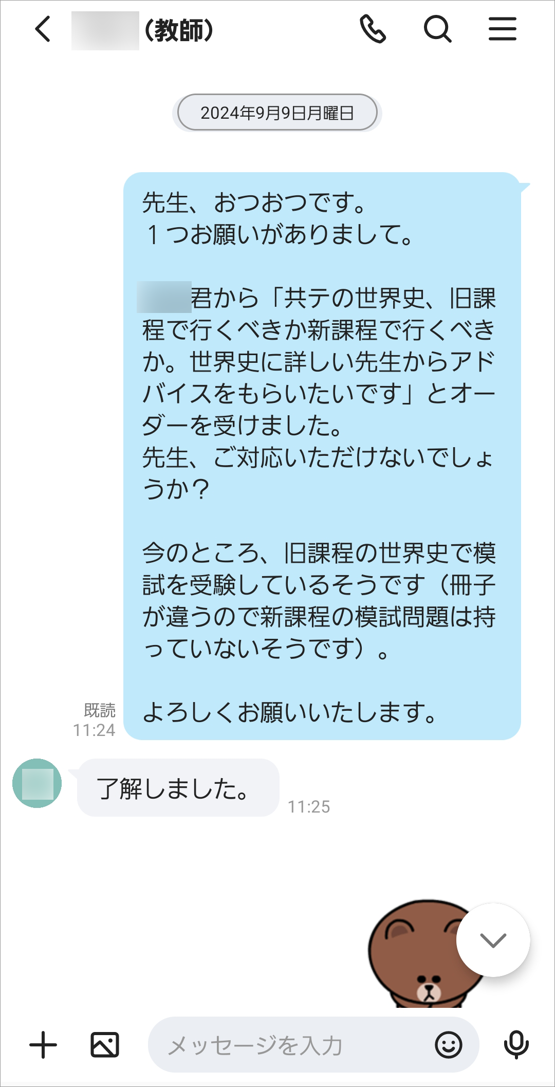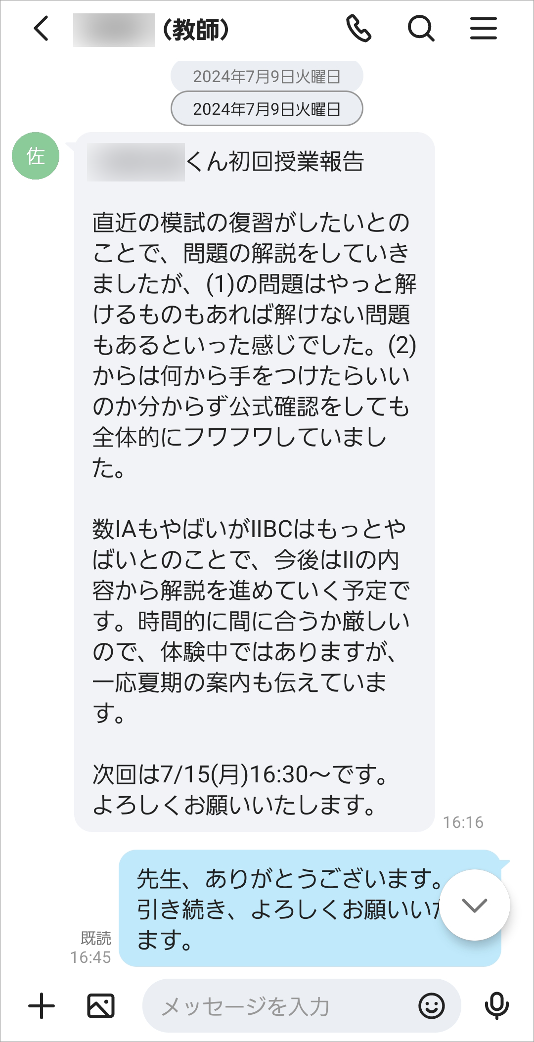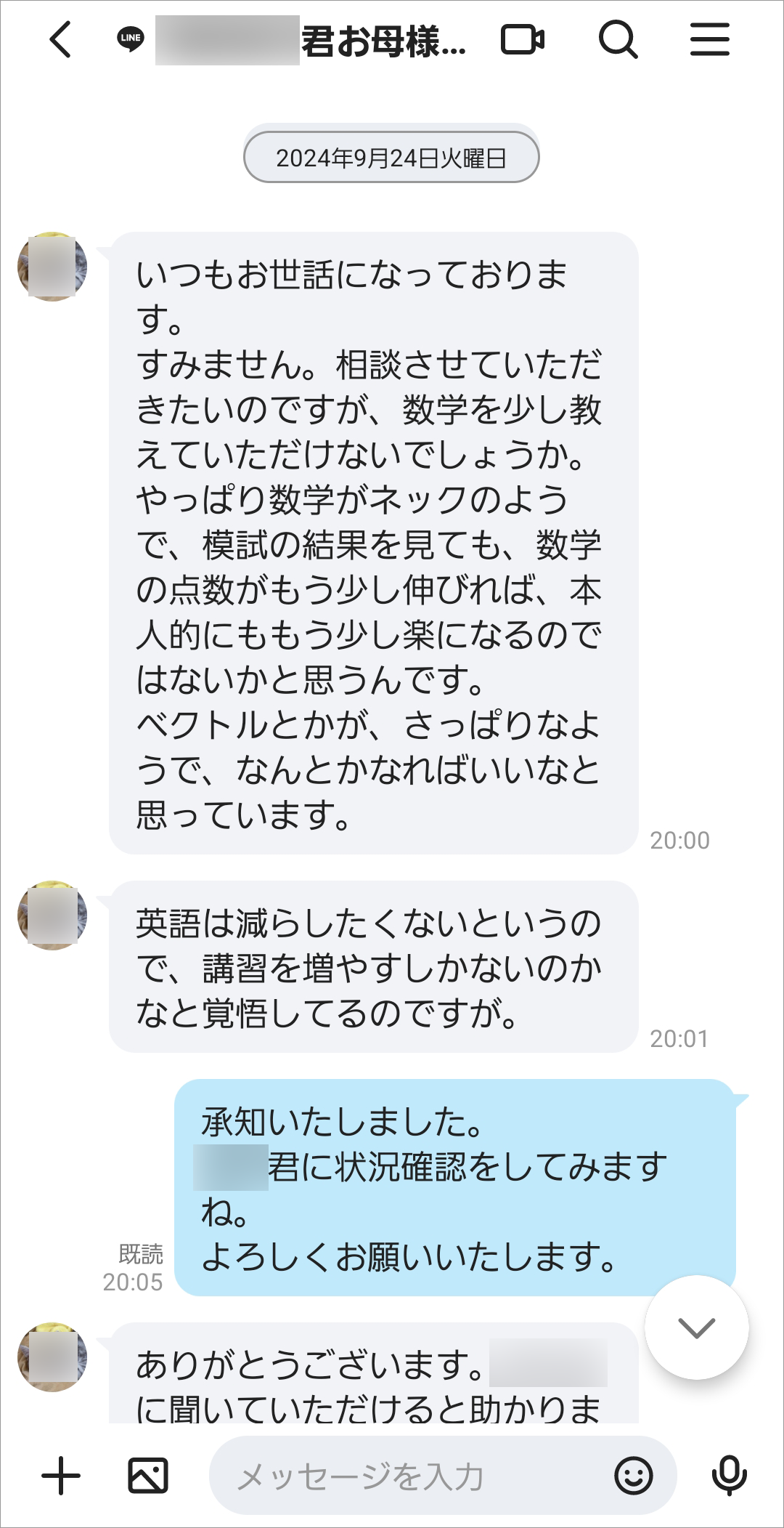 「体調を崩したので今日の指導は欠席させます」といった保護者からの事務的な連絡だけではなく、「子どもの学習意欲を高めさせるに親はどうすればいいか」といった相談や、学習内容に関する生徒からの質問にもしっかり応えられるようになったことで、当塾に対する満足度が以前と比べて確実に高まっています