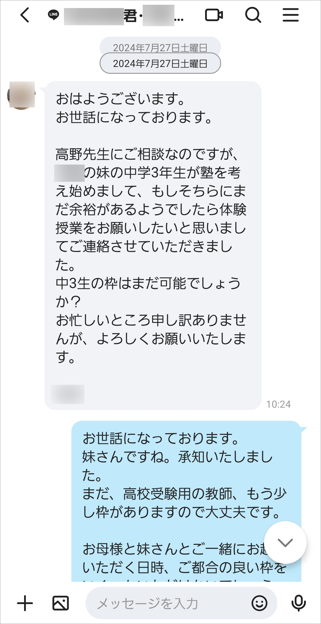 肌感覚ではありますが、LINE WORKSで保護者のLINEとつながり、以前より丁寧に相談に対応できるようなったことで、退塾者が減っています。生徒を通わせている保護者が、別の保護者に当塾のLINE WORKSアカウントを紹介してくださることも多く、塾長と保護者がつながることで信頼関係が生まれ、その結果として入塾する生徒も増えています