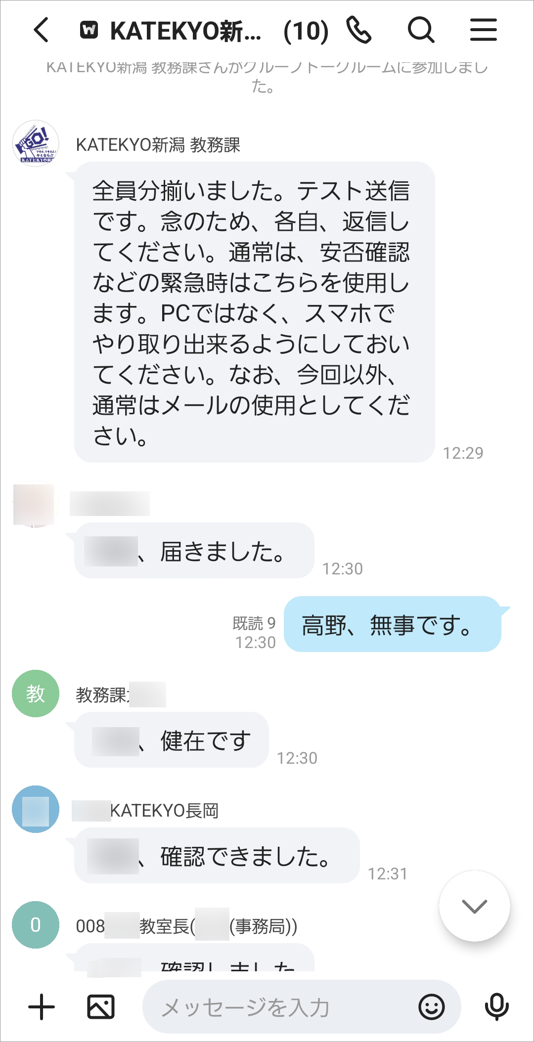 緊急時の安否確認訓練をLINE WORKSで実施し、万一の事態に備えている
