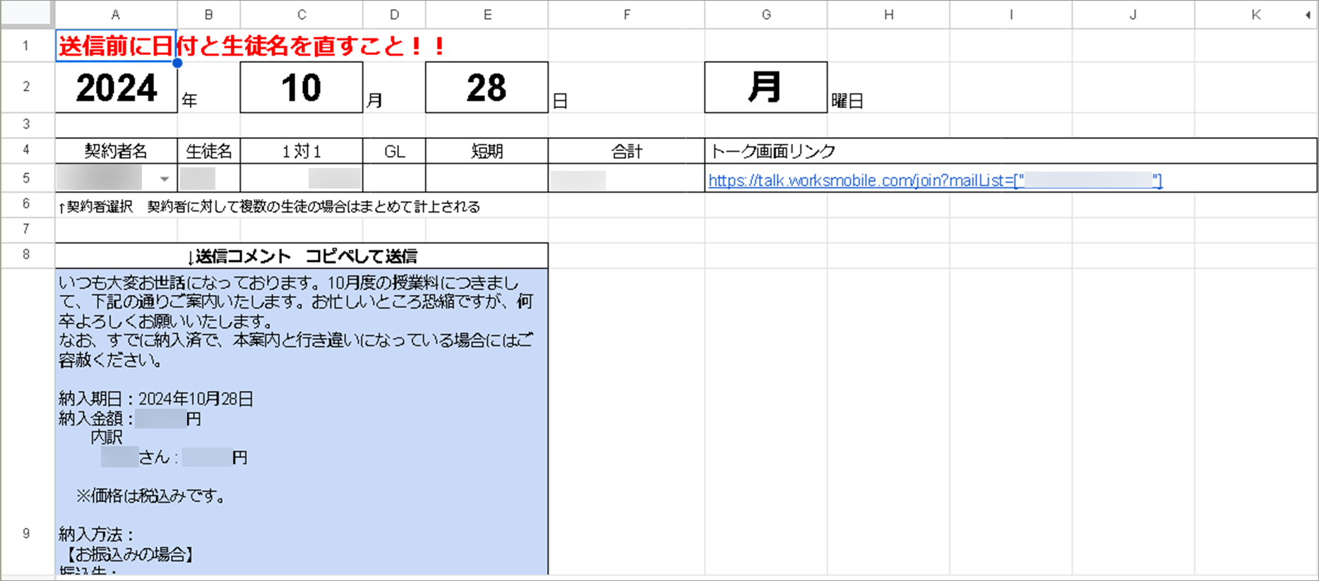 生徒ごとの毎月の授業料はGoogleスプレッドシートで計算し、保護者宛てに請求する文面を自動作成していますが、以前はそれをプリントアウトして郵送していました。LINE WORKS導入後はその内容を保護者のLINEに送信するようになりましたが、いちいちアドレス帳から宛先を検索するのが煩雑だったため、スプレッドシート上に貼り付けたURLをクリックすればトークの送信画面が立ち上がり、メッセージをスムーズに送れる仕組みを構築。これによって請求業務が大幅に効率化しています。