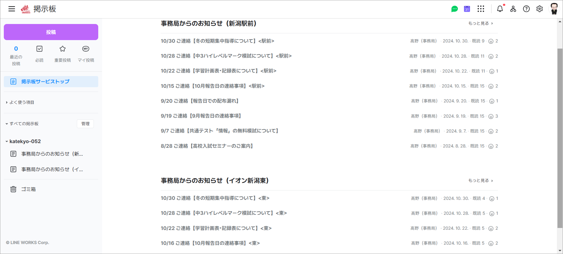 教室長から各教室の教師への通知・通達は、月1回の対面ミーティングのときに紙の文書で伝えていましたが、今は教室ごとの掲示板を設けて随時投稿。会議の議事録や研修資料などもアップし、重要な情報をタイムリーに周知するようにしています。