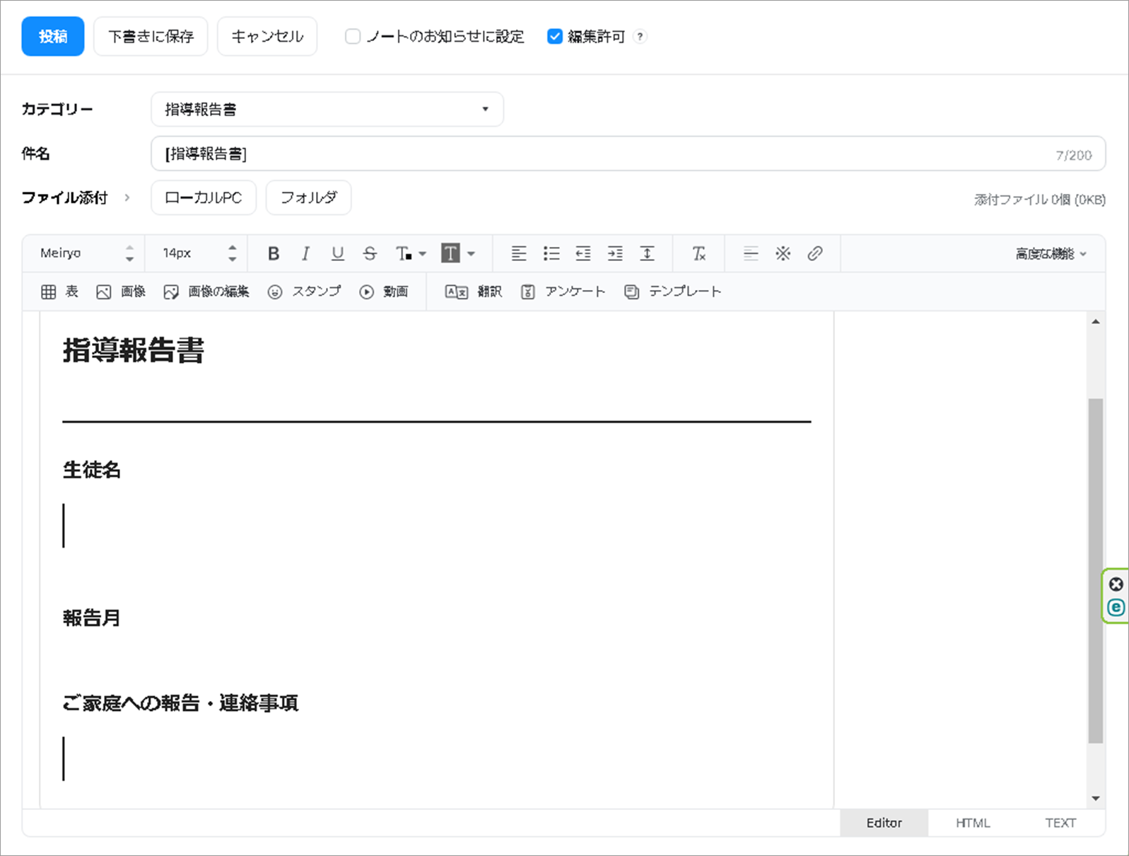 指導報告書作成にテンプレート機能を活用。教室長と保護者への報告がスムーズになった