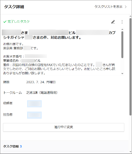 検査員に取り次ぐべきお客さまからの問い合わせなどは、タスク機能で課ごとに共有・管理するようになりました。電話を受けた事務職員は、担当者と紐づくお客さま番号と用件を記して依頼しています。依頼から完了までの流れが一目瞭然です。