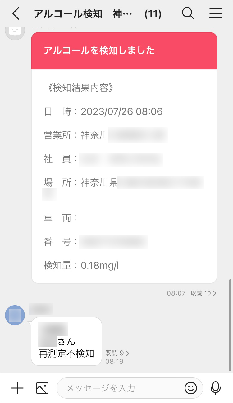 職員に貸与する携帯をスマホに更新したのを機に、アルコールチェックに関連する課題も解消するべく、パイ・アール社のスマホ連動型アルコール検知システムのアルキラーPlusを導入。LINE WORKSと連携させ、呼気から基準値以上の濃度のアルコールが検知されると、その情報が管理者のグループトークに一斉送信される仕組みを構築しました。通知を見たメンバーには既読がつき、管理者相互でメッセージを確認したかどうかが分かるので、チェック体制の強化につながっています。