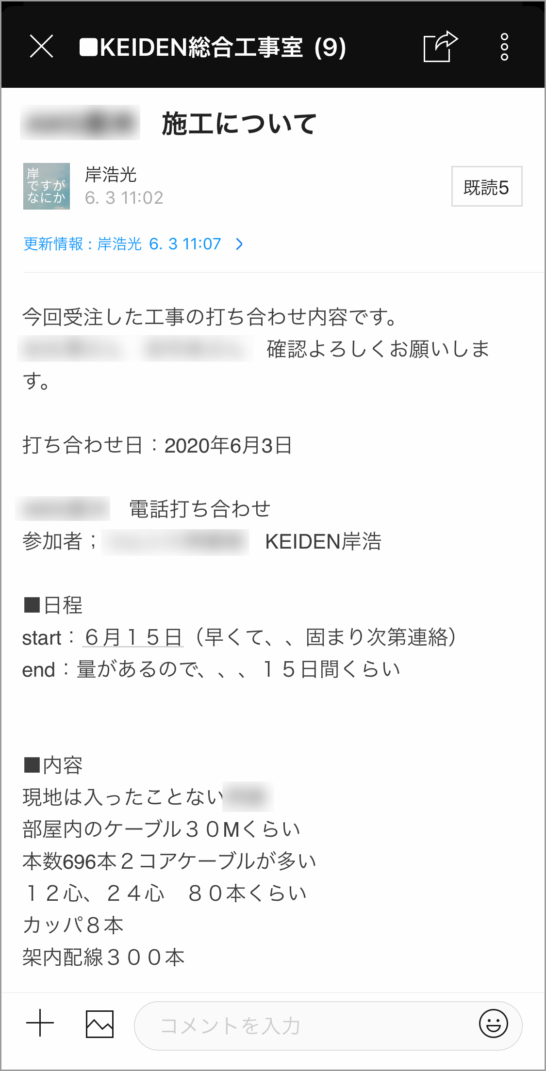 通信設備工事の件数は、新型コロナの影響で目立って減ってはいませんが、一部の社員は在宅ワークをする機会が増えました。それでも以前と変わらずに業務を継続できているのは、LINE WORKSによって社内の連絡体制が整備されていたからです。感染予防策の周知や個々の社員の体調確認なども容易にできることは、大きな安心感につながっています。