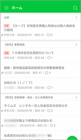 各部署からの社員への重要なお知らせや通達事項は、ホーム(掲示板)にアップしています。カテゴリ毎に閲覧できるユーザーを制限することで全社向けや本社向けなど、対象となる社員に応じた情報発信をできるのが便利です。