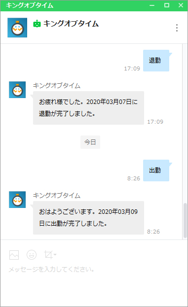 - 「出勤」「退勤」、チャットで単語を送るだけ。勤怠管理も効率化