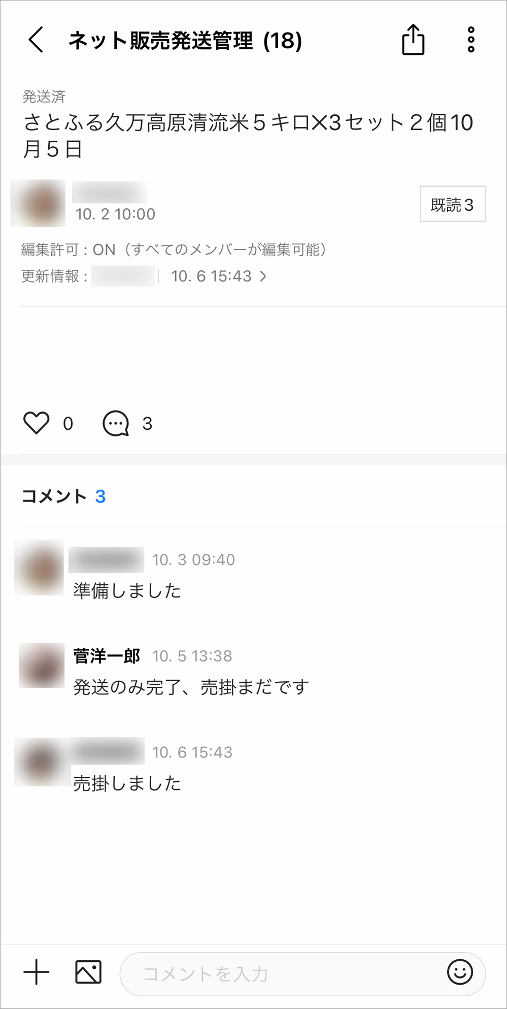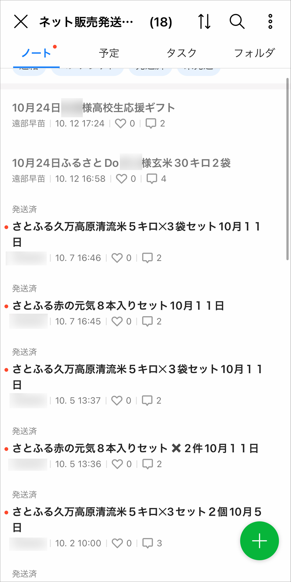 ふるさと納税返礼品などの発送までの進捗を1案件ずつノートで管理。担当者が投稿するコメントによっていつどんな処理がなされたかが一目瞭然