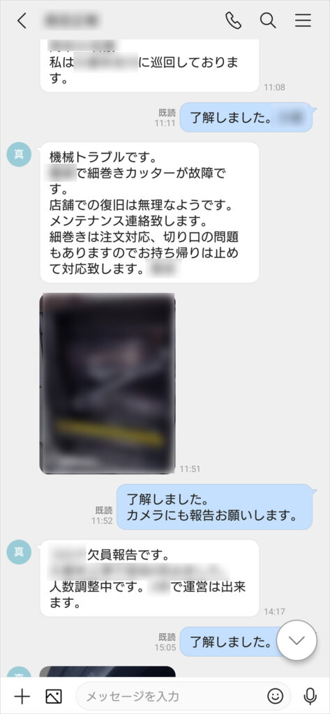 スーパーバイザー、エリアマネージャー、ブロック長どうしのやり取りも、電話とSMSからトークに置き換わりました。これまで店舗に急ぎの伝達事項があるときは、以前は店舗1軒ずつに電話をかけなければなりませんでしたが、LINE WORKS導入後は、エリア単位の店舗グループにトークを1回送るだけで伝達完了となります。また、電話ではどうしても用件以外のちょっとした会話もすることになりますが、それがトークに置き換わったことで、連絡に要する時間が大幅に短縮されました。