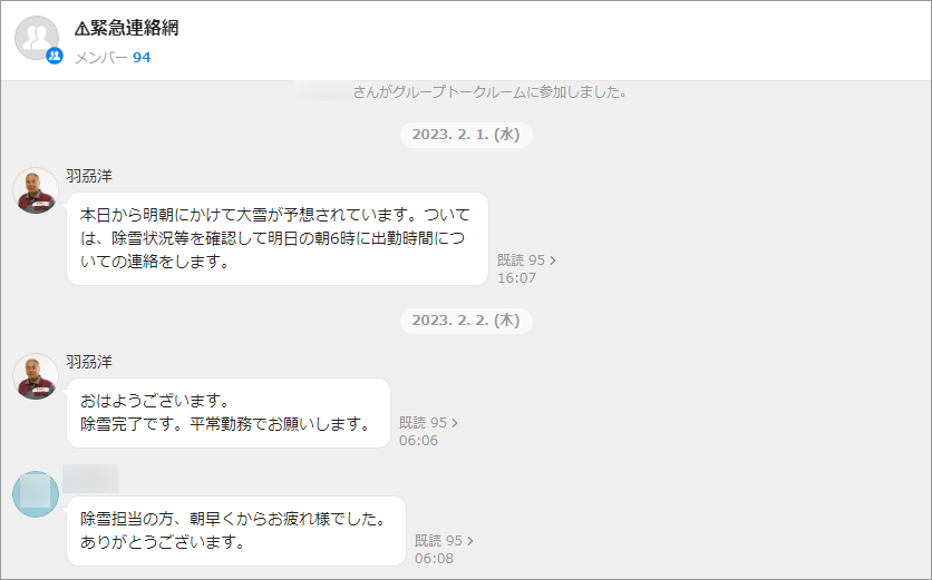 当社が立地する釧路は地震が多く、東日本大震災でも津波被害が出ています。緊急時の対応方針をすぐに伝えるために、全社員が入った「緊急連絡網」グループを作りました。LINE WORKSはスマホでも使いやすく、また誰がメッセージを読んだか個人単位で把握できる既読機能があり、非常時の社員の安否確認をスムーズに行うのに有用だと考えました。