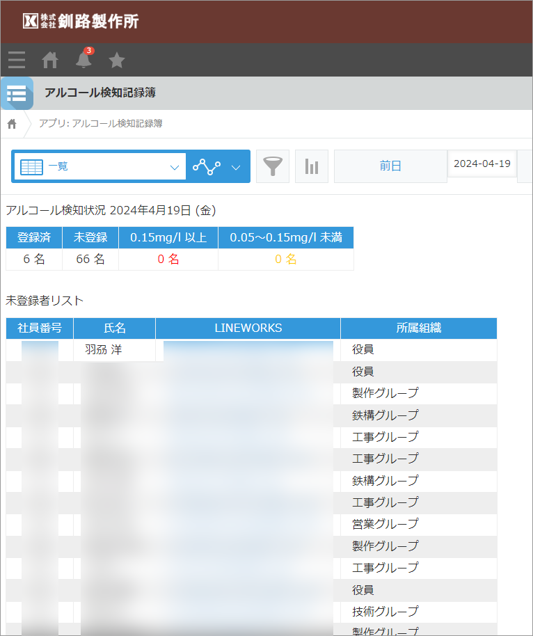 ドライバーの飲酒検査義務化が白ナンバー車を使う事業者にも拡大されることを受け、アルコールチェッカーによる測定結果をLINE WORKSのBotから入力すると、そのデータがkintoneのアルコールチェック記録アプリに保存される仕組みもつくりました。kintoneからいつでも入力の有無を確認でき、登録されたデータの検索も可能なので、記録保管における安全管理担当者の負担が軽減されています。