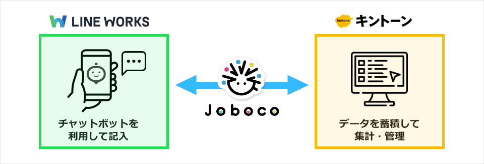 Joboco・・・LINE WORKSと業務アプリ構築サービス「kintone」を連携するチャットボットをブラウザから簡単に作成できるサービス。