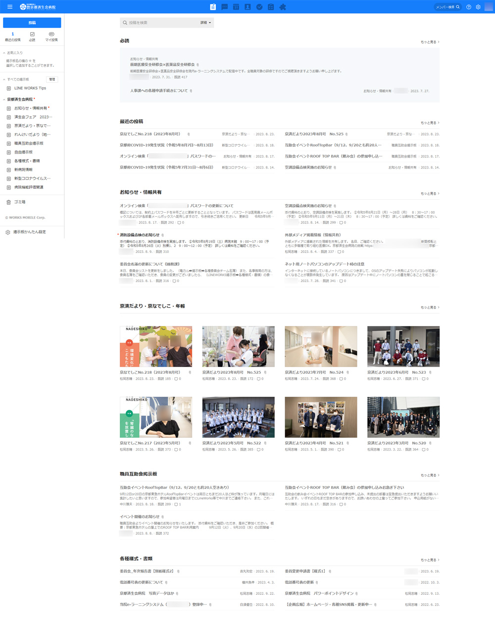 各種お知らせや研修の案内、紙で発行している広報誌、院長による年頭の挨拶の動画やLINE WORKSの利用ガイドなどを、職員がいつでも閲覧できるよう掲示板にアップしています。動画や写真、URLリンクなど紙では表現し難い媒体の共有に掲示板は非常に便利です。