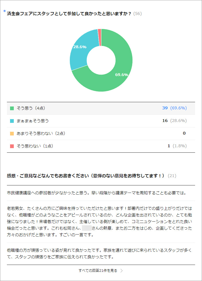 企画広報室では定期的に、院内の情報共有に対する職員の評価をアンケートで収集しています。院内外の広報の改善に取り組んだ結果「当院は院内情報共有ができていると思うか」「あなたは必要な情報を適切に入手できているか」という項目に対する評価は、統計分析上有意な形で年々向上。LINE WORKSに関しては、2022年の全職員での運用開始後のアンケートでは、およそ8割の職員が「LINE WORKSから情報を得ている」と回答し、高い導入効果が得られています。