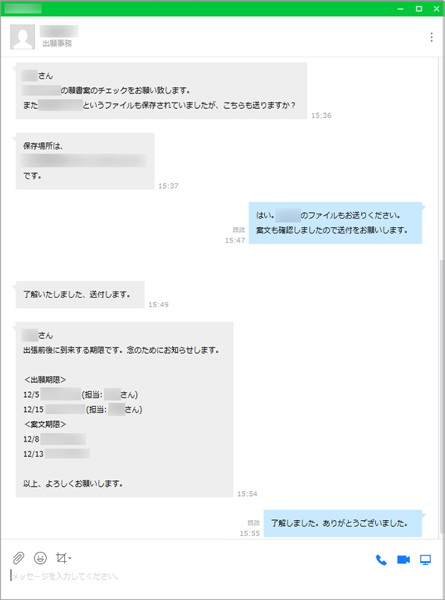 特許出願手続きなどの過程では、弁理士が事務担当者にサポートしてもらうための業務指示を頻繁に出します。もともとメッセンジャーソフトを利用するようになったのは、両者が同じオフィス内の離れた場所にいるからですが、LINE WORKSのトークを利用するようになってからは、「1対1」、「1対多」ともスムーズに情報共有をできるようになり、以前のように「これはいつ送ったどのメッセージへのリプライなのか?」と迷うこともなくなりました。1対1のトークやグループトークなど、目的別に作成したトークルームでスピーディにコミュニケーションが図れるようになったことは、業務効率化にもつながっていると思います。