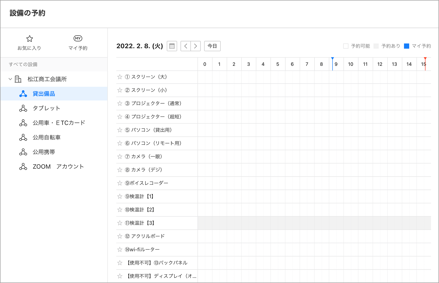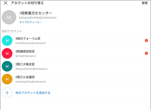会議室のアカウントは、タブレットにて使用し、マルチログインできるようにしています。商工会議所は外部に会議室を貸出することが多く、予約を受け付ける職員が誰であってもタブレットを見れば空き状況の確認と貸出予約ができます。同様に、確定申告の相談ブースにもアカウントを作成して予約などを管理しています。