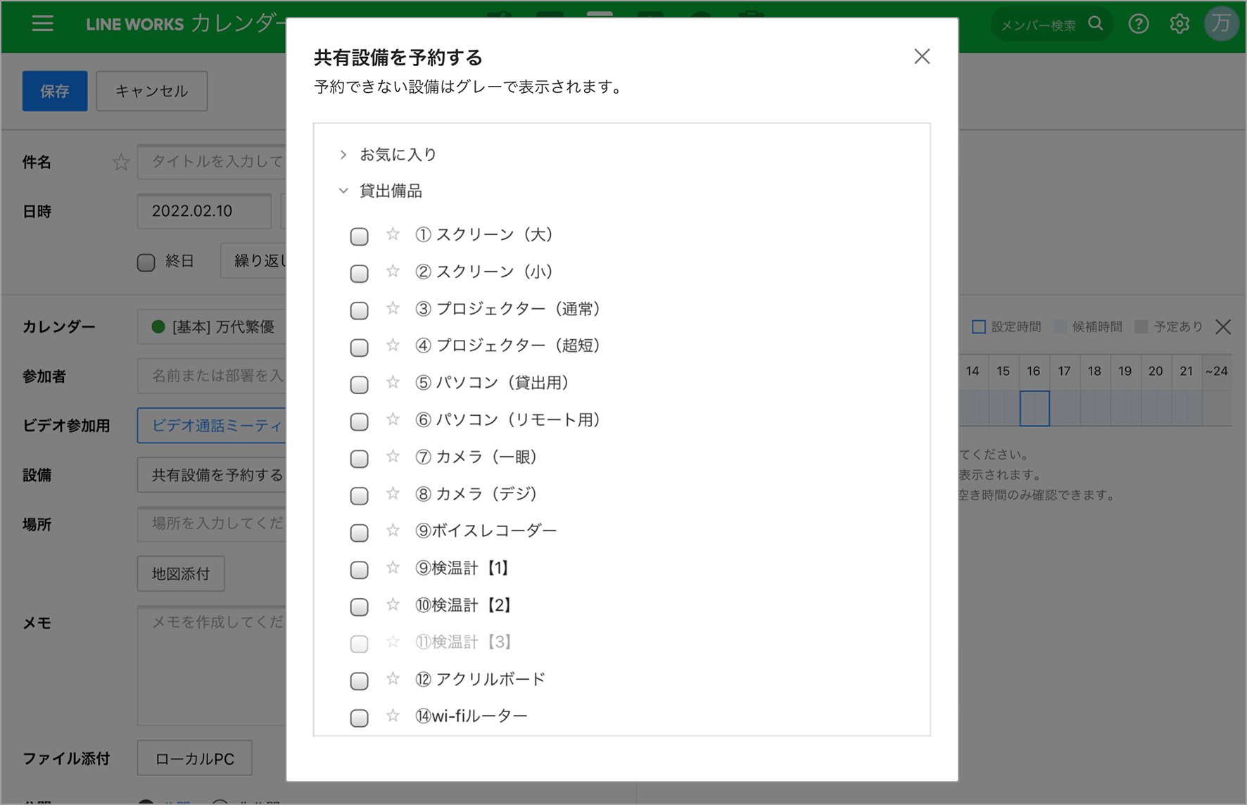 会議室で使用する備品の予約はカレンダーの共有設備の予約機能を活用。
