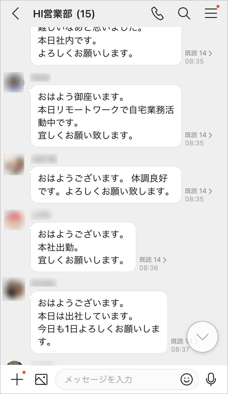 コロナ禍で多くの社員がテレワークをするようになってからは、部内のグループトークで各メンバーが始業時・終業時の挨拶を交わすようになりました。対面しなくても、お互いに元気だということが伝わって安心することができます。