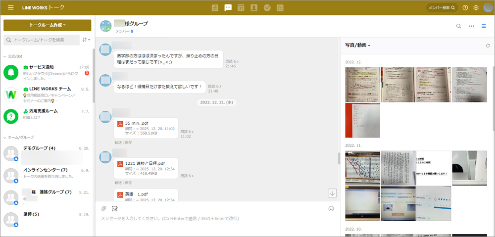 さらに、生徒が参加するトークルームとは別に、教師や教務担当者間の業務連絡をするためのトークルームがあります。例えば、ある生徒が複数の教科を受講している場合、各教科の担当教師どうしで、その時の生徒の状況に合わせて教科別に時間配分の調整をトークで行なうようになりました。これまで当社では、教師どうしのつながりはあまりなかったのですが、こうしたコミュニケーションができるようになったのもLINE WORKSの導入成果です。