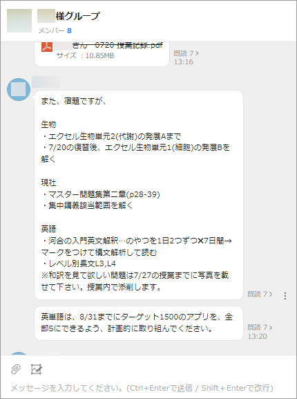 私が行う授業は宿題をベースに実施しており、トークで問題を送信し、生徒から返信された答案に添削したものを画面共有しながら進めていきます。