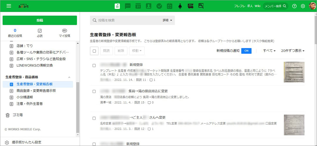 新規の生産者の申し込みは公式ホームページから受け付けており、登録された生産者情報はLINE WORKSの「生産者登録」の掲示板へ掲載します。生産者への納品方法のご案内や商品の受け取りなどは掲示板を確認して、営業と集荷を担当する社員が対応します。