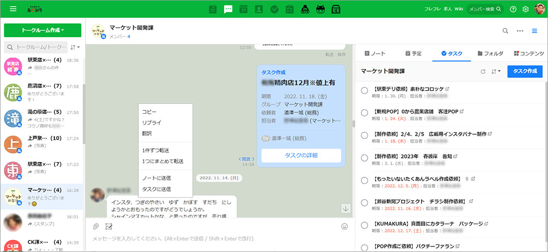 各店舗からの意見や依頼がデザイナーに次々と届くのですが、LINEでやりとりをしていたころはトークがどんどん流れていってしまい、情報整理が追い付かず煩雑に感じることもありました。しかしLINE WORKSは、任意のトークを右クリックすることで、すぐにタスク機能の一覧へ保存できます。トークをタスクとしてリスト化できることで進捗管理がしやすくなり、デザイナーもよろこんでいます。