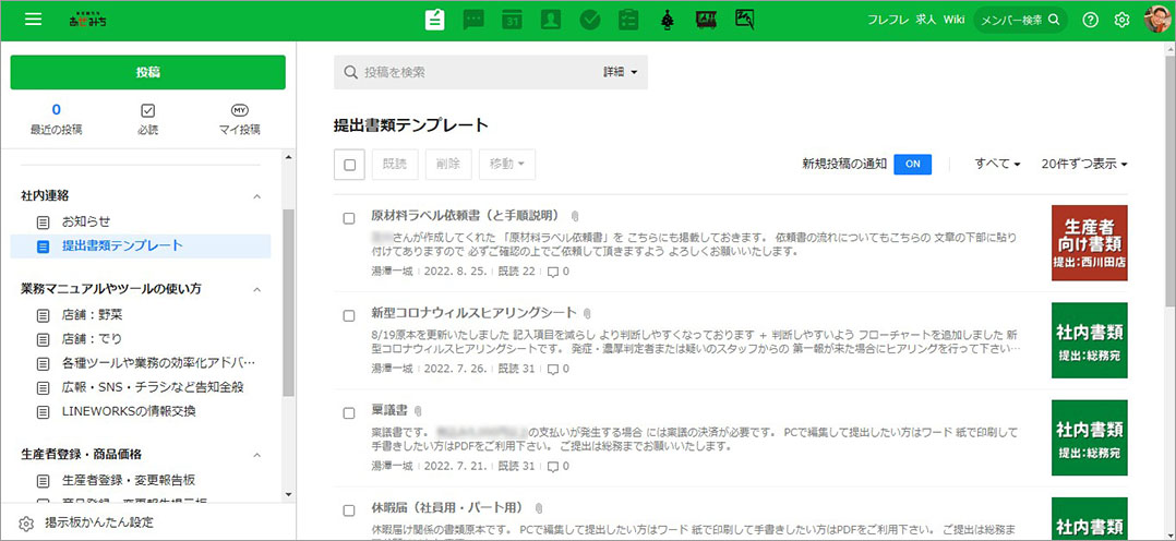 野菜の価格変動のお知らせや総務関連の提出書類の文書テンプレートを掲示板に掲載しています。掲示板には必読機能があり、未読の人に再周知することができるので便利です。