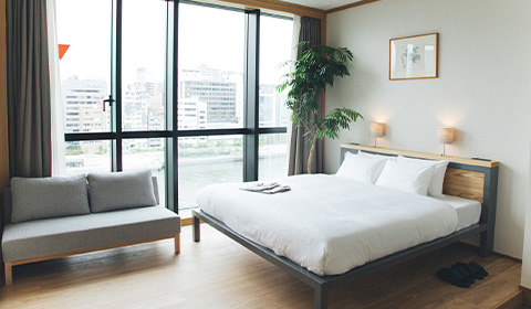 「忙しい日常から少し離れて、ニュートラルな気持ちで過ごしてほしい」という思いから、客室にはテレビや冷蔵庫を置かず、シンプルにまとめる一方、アートと植物を客室ごとに用意し、窓からは大川(旧淀川)や緑豊かな公園が望めるなど、居心地のいい空間づくりを追求。1階のカフェラウンジは、宿泊客はもちろん、近隣の人でも利用できるよう、豊富なメニューを用意。