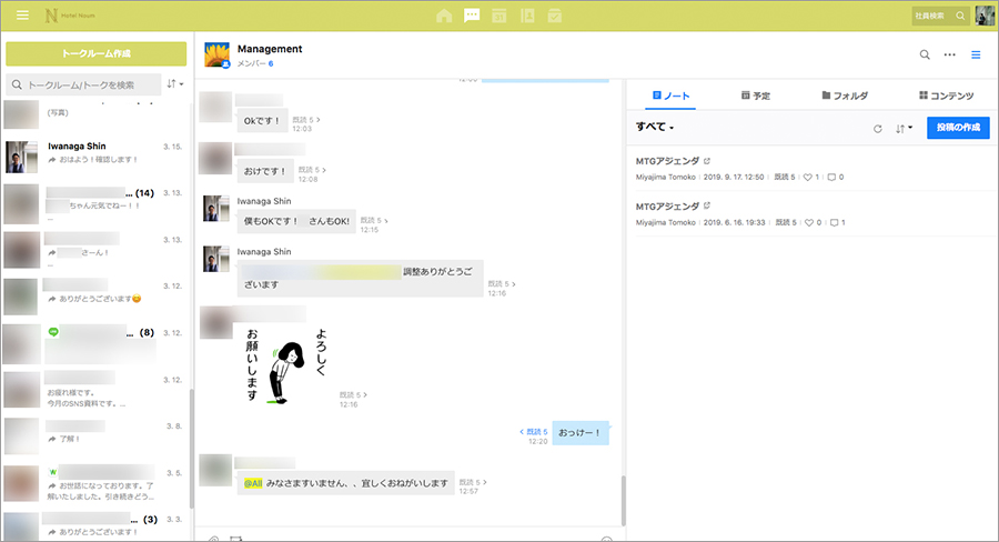 そのほか、ホームには毎日、その日の売り上げやチェックイン数を日報としてアップしています。スタッフ連絡網にはシフト表や各種お知らせ、事務手続きで必要な書類など、随時必要なものを掲示しますし、チームごとのミーティングの議事録などもあります。さまざまな情報が一つの場所に集約され、個人のスマホに通知するツールがあるからこそ、アルバイトスタッフもパートスタッフも、情報には常に関心を持ち続けてもらえるのでは、と思います。