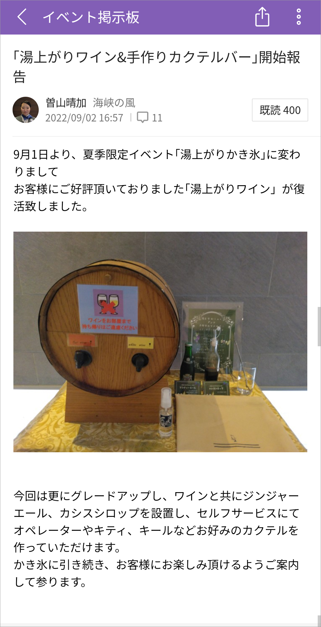 掲示板には各ホテル・旅館が実施する取り組みやイベントが活発に投稿されています。例えば10月には「当ホテルではハロウィンイベントを始めました!」といった投稿もありました。ほかの施設の取り組みはとても新鮮で参考になりますし、私自身も毎日楽しく見ております。