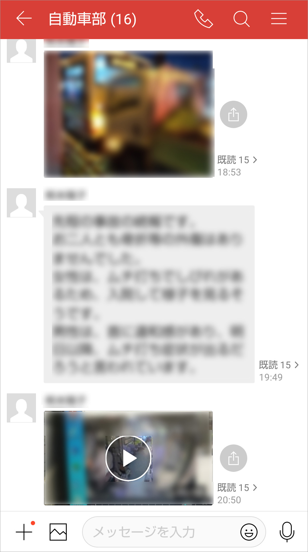 運行中のバスがトラブルに遭遇した際、営業所から報告を受けた自動車部が、関係者に一斉に情報を発信できるようになりました。以前は通常の業務時間外や休日に情報を伝えるのに特に時間がかかりましたが、トークならそのようなこともありません。また、現場の写真や動画も添付できるので、言葉だけでは十分に伝えにくい情報もしっかり伝達できるようになりました。既読機能も個人単位でわかるので、便利です。