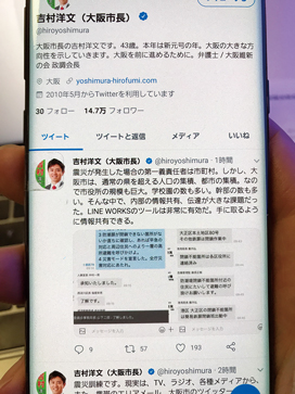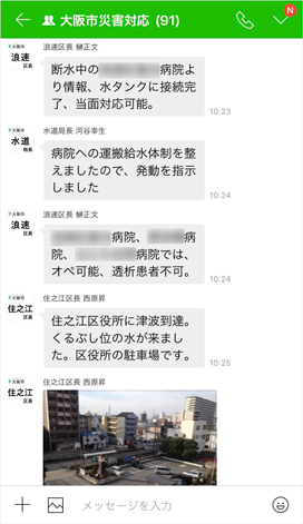 「大阪市震災総合訓練」では、市長が市民を3階以上の建物に避難させるようLINE WORKSで指示したところ、「区民の避難を公用車で呼び掛けます」といった区長からのレスポンスがわずか数分後には得られるなど、各担当者の迅速な行動が確認されました。また、そうしたやり取りはグループメンバー全員で共有されるので、この訓練では災害対策本部全体にかつてない一体感が生まれていることを感じました。市長自身もツイッターで、「LINE WORKSのツールは非常に有効だ。手に取るように情報共有できる」とつぶやいています。