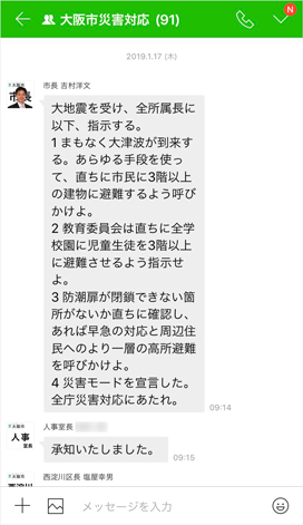 「大阪市震災総合訓練」では、市長が市民を3階以上の建物に避難させるようLINE WORKSで指示したところ、「区民の避難を公用車で呼び掛けます」といった区長からのレスポンスがわずか数分後には得られるなど、各担当者の迅速な行動が確認されました。また、そうしたやり取りはグループメンバー全員で共有されるので、この訓練では災害対策本部全体にかつてない一体感が生まれていることを感じました。市長自身もツイッターで、「LINE WORKSのツールは非常に有効だ。手に取るように情報共有できる」とつぶやいています。