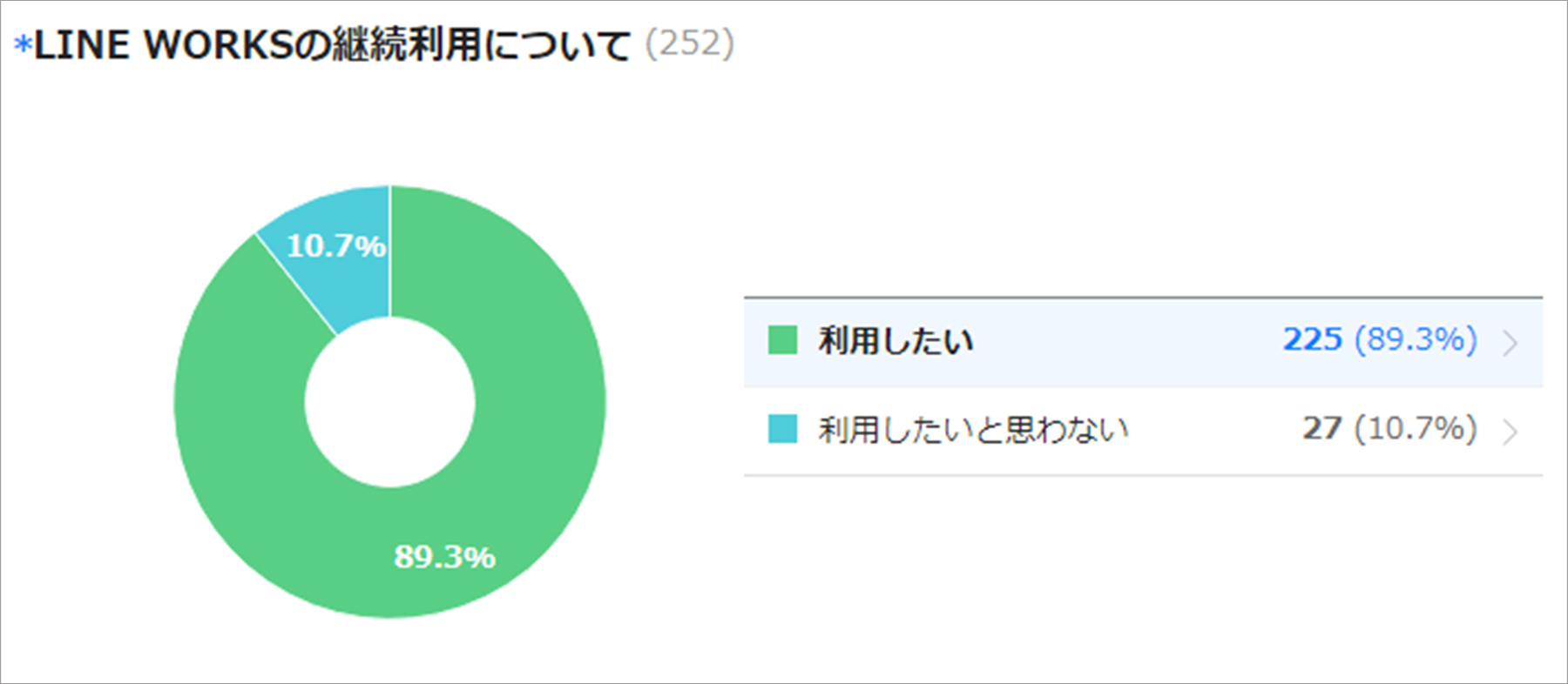 2ヶ月経過したころ、アンケート機能を使って、詳しい利用状況を調査しました。加えて数名の社員には、電話やメールがどのくらいトークに置き換わり、結果として業務連絡に要する時間がどれだけ短縮されたかを直接ヒアリング調査しました。アンケート結果から9割近くがLINE WORKSの継続利用を希望したことと、ヒアリング調査の結果からトークによって1ヶ月あたりに効率化される時間数が十分であることを試算できたことから、導入効果があると見込むことができました。